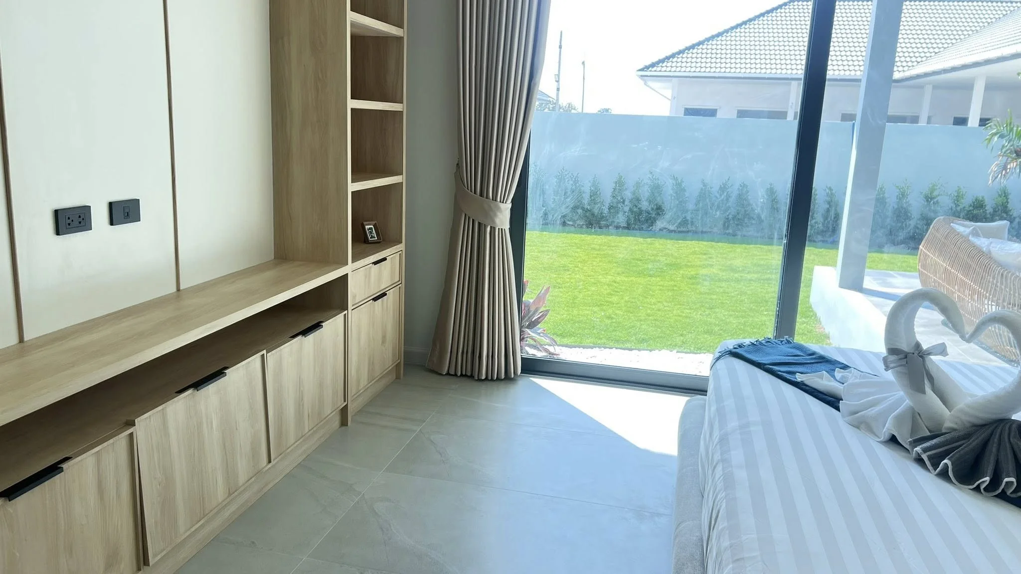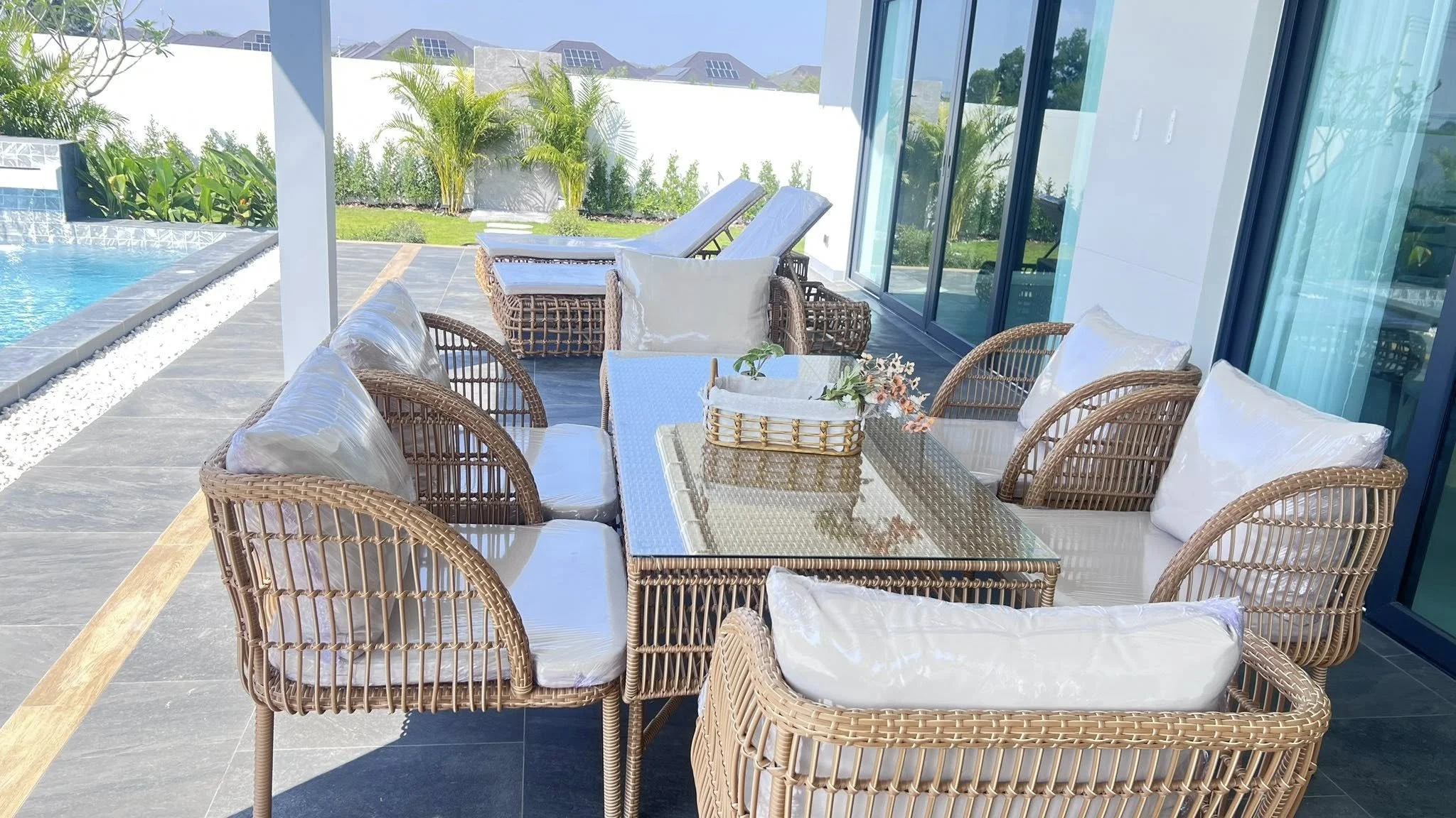Discover a residence where every detail has been curated to offer an unparalleled living experience. This brand-new pool villa transcends the ordinary, presenting a seamless transition between its sophisticated interiors and the lush, landscaped gardens that embrace it. Designed with a philosophy of open-air elegance, the architectural flow centers around a private sanctuary: a shimmering saltwater pool that serves as the heart of the home.